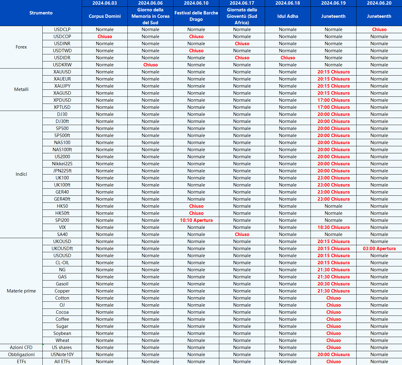 Vi informiamo che gli orari di negoziazione e gli orari delle sessioni di mercato dei seguenti strumenti saranno influenzati dalle prossime festività di giugno.