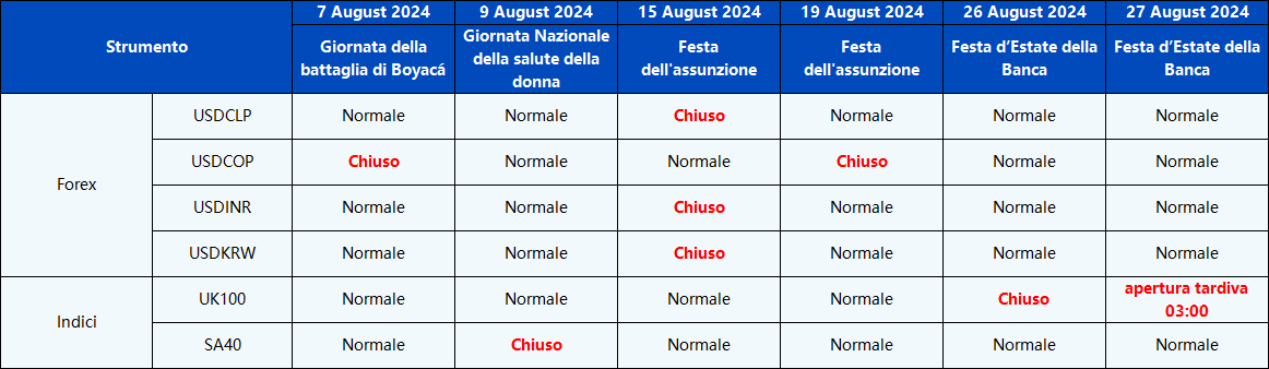 Vi informiamo che gli orari di negoziazione e gli orari delle sessioni di mercato dei seguenti strumenti saranno influenzati dalle prossime festività di agosto.