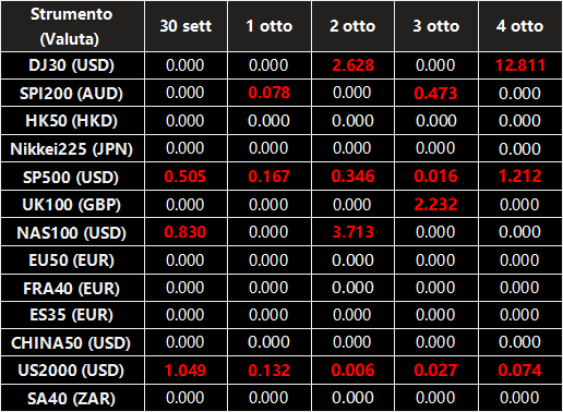 Si prega di notare che i dividendi dei seguenti CFD sull’indice saranno regolati dalle prossime date ex-dividendo. Il commento per il trading di CFD sull’indice sarà nel seguente formato “Div&<Product Name>&<Net Volume>” che appare nel saldo dopo la chiusura del giorno precedente alla data di pagamento del dividendo.