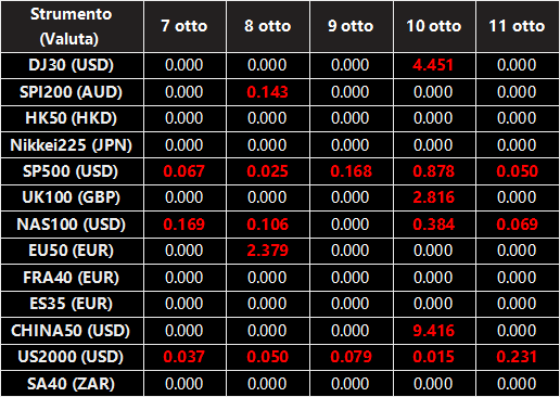 Si prega di notare che i dividendi dei seguenti CFD sull’indice saranno regolati dalle prossime date ex-dividendo. Il commento per il trading di CFD sull’indice sarà nel seguente formato “Div&<Product Name>&<Net Volume>” che appare nel saldo dopo la chiusura del giorno precedente alla data di pagamento del dividendo.