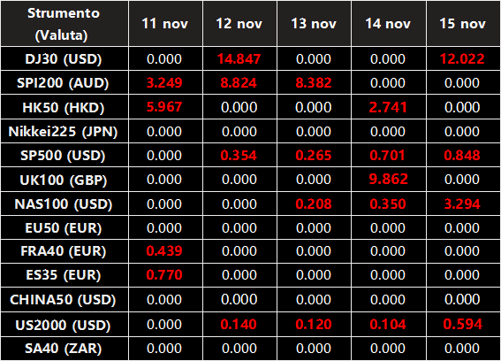 Si prega di notare che i dividendi dei seguenti CFD sull’indice saranno regolati dalle prossime date ex-dividendo. Il commento per il trading di CFD sull’indice sarà nel seguente formato “Div&<Product Name>&<Net Volume>” che appare nel saldo dopo la chiusura del giorno precedente alla data di pagamento del dividendo.