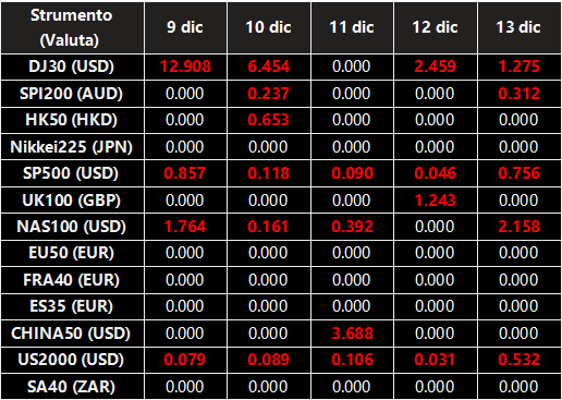 Si prega di notare che i dividendi dei seguenti CFD sull’indice saranno regolati dalle prossime date ex-dividendo. Il commento per il trading di CFD sull’indice sarà nel seguente formato “Div&<Product Name>&<Net Volume>” che appare nel saldo dopo la chiusura del giorno precedente alla data di pagamento del dividendo.