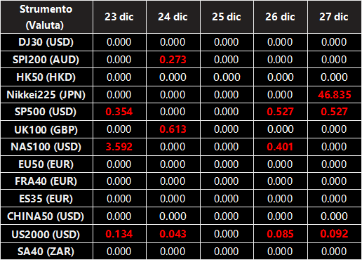 Si prega di notare che i dividendi dei seguenti CFD sull’indice saranno regolati dalle prossime date ex-dividendo. Il commento per il trading di CFD sull’indice sarà nel seguente formato “Div&<Product Name>&<Net Volume>” che appare nel saldo dopo la chiusura del giorno precedente alla data di pagamento del dividendo.
