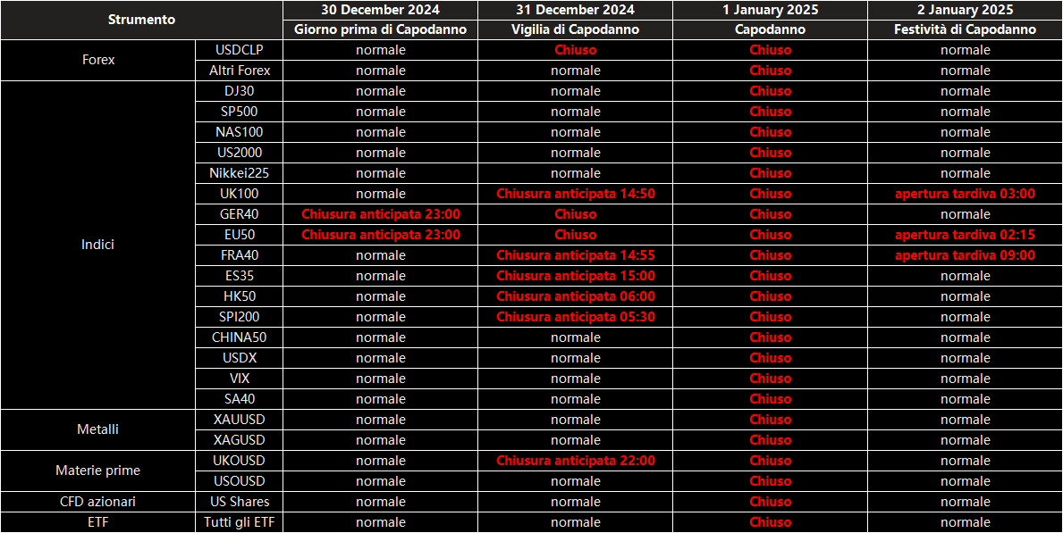 Si prega di notare che che gli orari di negoziazione e le sessioni di mercato dei seguenti strumenti saranno influenzati dalle prossime festività di Capodanno.