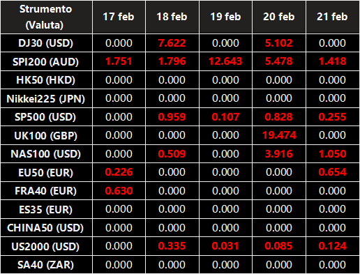 Si prega di notare che i dividendi dei seguenti CFD sull’indice saranno regolati dalle prossime date ex-dividendo. Il commento per il trading di CFD sull’indice sarà nel seguente formato “Div&<Product Name>&<Net Volume>” che appare nel saldo dopo la chiusura del giorno precedente alla data di pagamento del dividendo.