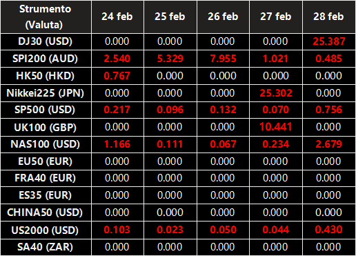 Si prega di notare che i dividendi dei seguenti CFD sull’indice saranno regolati dalle prossime date ex-dividendo. Il commento per il trading di CFD sull’indice sarà nel seguente formato “Div&<Product Name>&<Net Volume>” che appare nel saldo dopo la chiusura del giorno precedente alla data di pagamento del dividendo.