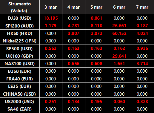Si prega di notare che i dividendi dei seguenti CFD sull’indice saranno regolati dalle prossime date ex-dividendo. Il commento per il trading di CFD sull’indice sarà nel seguente formato “Div&<Product Name>&<Net Volume>” che appare nel saldo dopo la chiusura del giorno precedente alla data di pagamento del dividendo.