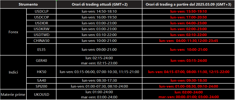 Ad eccezione del cambiamento dell’orario del server nel sistema MT4/MT5, si prega di consultare la tabella sottostante per il programma di tutti gli strumenti soggetti a modifiche: