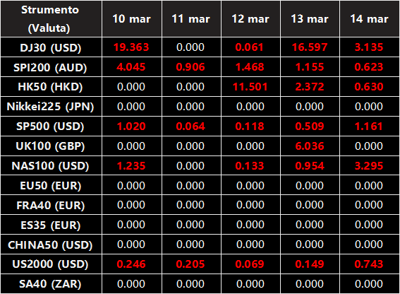 Si prega di notare che i dividendi dei seguenti CFD sull’indice saranno regolati dalle prossime date ex-dividendo. Il commento per il trading di CFD sull’indice sarà nel seguente formato “Div&<Product Name>&<Net Volume>” che appare nel saldo dopo la chiusura del giorno precedente alla data di pagamento del dividendo.