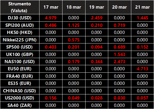 Si prega di notare che i dividendi dei seguenti CFD sull’indice saranno regolati dalle prossime date ex-dividendo. Il commento per il trading di CFD sull’indice sarà nel seguente formato “Div&<Product Name>&<Net Volume>” che appare nel saldo dopo la chiusura del giorno precedente alla data di pagamento del dividendo.