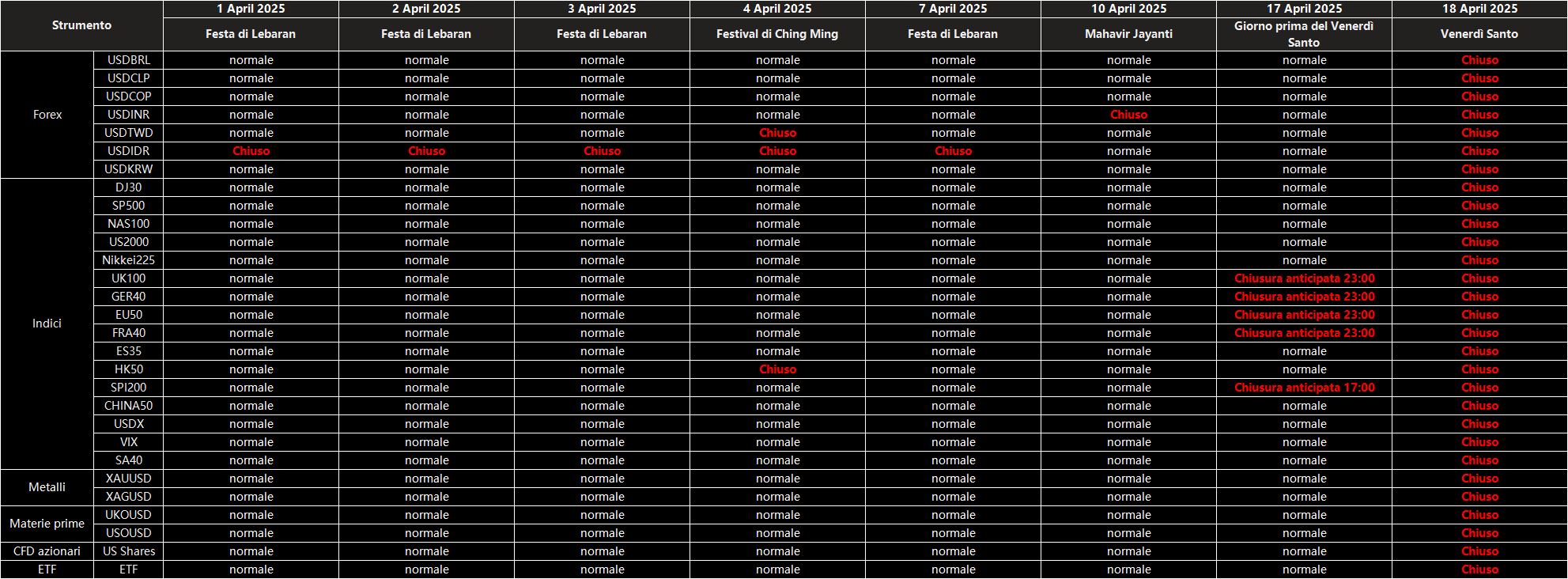 Vi informiamo che gli orari di negoziazione e le sessioni di mercato dei seguenti strumenti saranno influenzati dalle prossime festività di inizio aprile.