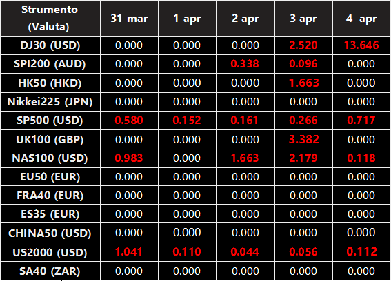 Si prega di notare che i dividendi dei seguenti CFD sull’indice saranno regolati dalle prossime date ex-dividendo. Il commento per il trading di CFD sull’indice sarà nel seguente formato “Div&<Product Name>&<Net Volume>” che appare nel saldo dopo la chiusura del giorno precedente alla data di pagamento del dividendo.