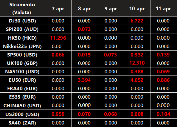 Si prega di notare che i dividendi dei seguenti CFD sull’indice saranno regolati dalle prossime date ex-dividendo. Il commento per il trading di CFD sull’indice sarà nel seguente formato “Div&<Product Name>&<Net Volume>” che appare nel saldo dopo la chiusura del giorno precedente alla data di pagamento del dividendo.