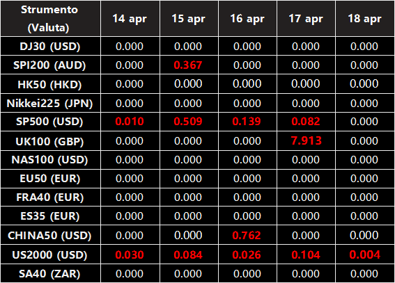 Si prega di notare che i dividendi dei seguenti CFD sull’indice saranno regolati dalle prossime date ex-dividendo. Il commento per il trading di CFD sull’indice sarà nel seguente formato “Div&<Product Name>&<Net Volume>” che appare nel saldo dopo la chiusura del giorno precedente alla data di pagamento del dividendo.