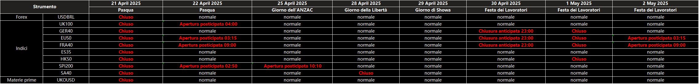 Si prega di notare che gli orari di negoziazione e le sessioni di mercato dei seguenti strumenti saranno influenzati dalle prossime vacanze di aprile e del 1° maggio.