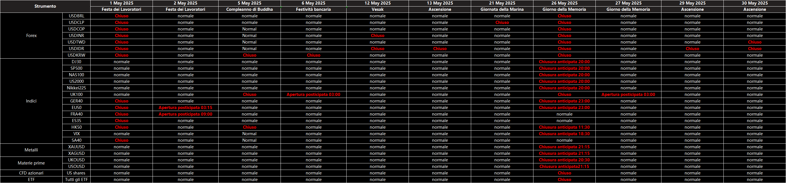 Si prega di notare che che gli orari di negoziazione e le sessioni di mercato dei seguenti strumenti saranno influenzati dalle prossime vacanze di Maggio.