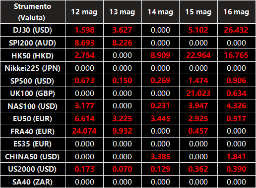 Si prega di notare che i dividendi dei seguenti CFD sull’indice saranno regolati dalle prossime date ex-dividendo. Il commento per il trading di CFD sull’indice sarà nel seguente formato “Div&<Product Name>&<Net Volume>” che appare nel saldo dopo la chiusura del giorno precedente alla data di pagamento del dividendo.