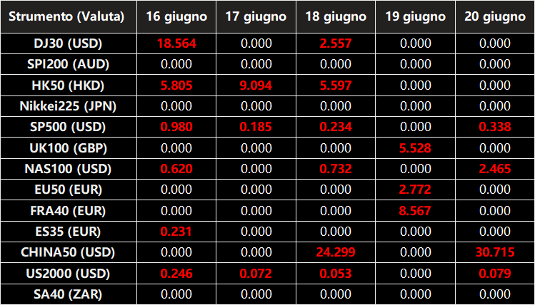 Si prega di notare che i dividendi dei seguenti CFD sull’indice saranno regolati dalle prossime date ex-dividendo. Il commento per il trading di CFD sull’indice sarà nel seguente formato “Div&<Product Name>&<Net Volume>” che appare nel saldo dopo la chiusura del giorno precedente alla data di pagamento del dividendo.