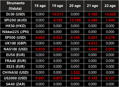 Si prega di notare che i dividendi dei seguenti CFD sull’indice saranno regolati dalle prossime date ex-dividendo. Il commento per il trading di CFD sull’indice sarà nel seguente formato “Div&<Product Name>&<Net Volume>” che appare nel saldo dopo la chiusura del giorno precedente alla data di pagamento del dividendo.